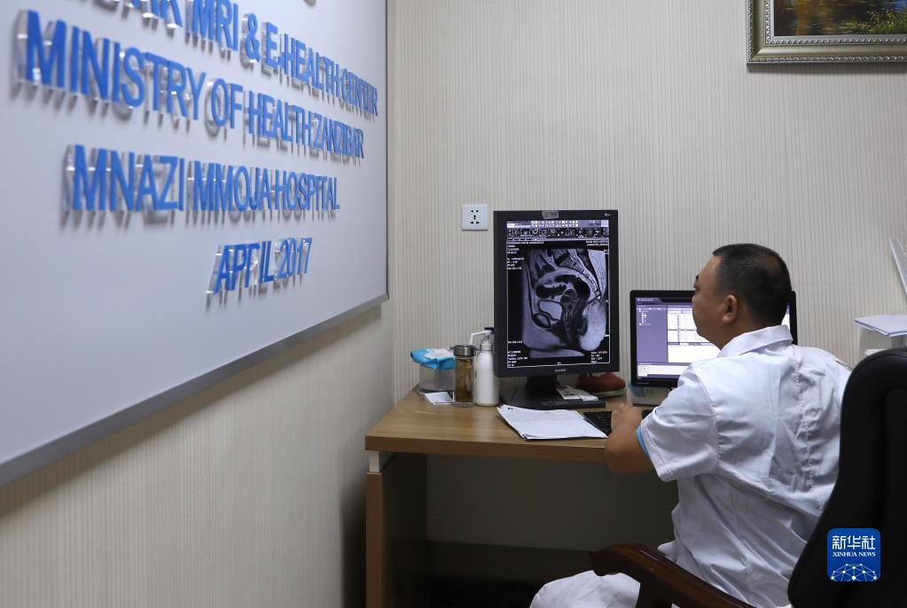 2月22日,在坦桑尼亞桑給巴爾島納茲莫加醫院,影像科醫生楊維柘查看核磁共振檢查結果。