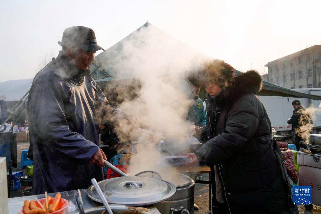 2月23日,河北省遵化市新店子集市上,人們在熱氣騰騰的小吃攤前購買(mǎi)美食。