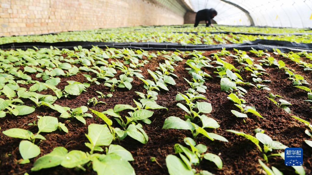 2月23日,工人在甘肅省定西市安定區香泉鎮馬鈴薯種薯扶貧產(chǎn)業(yè)園管護脫毒種薯苗。
