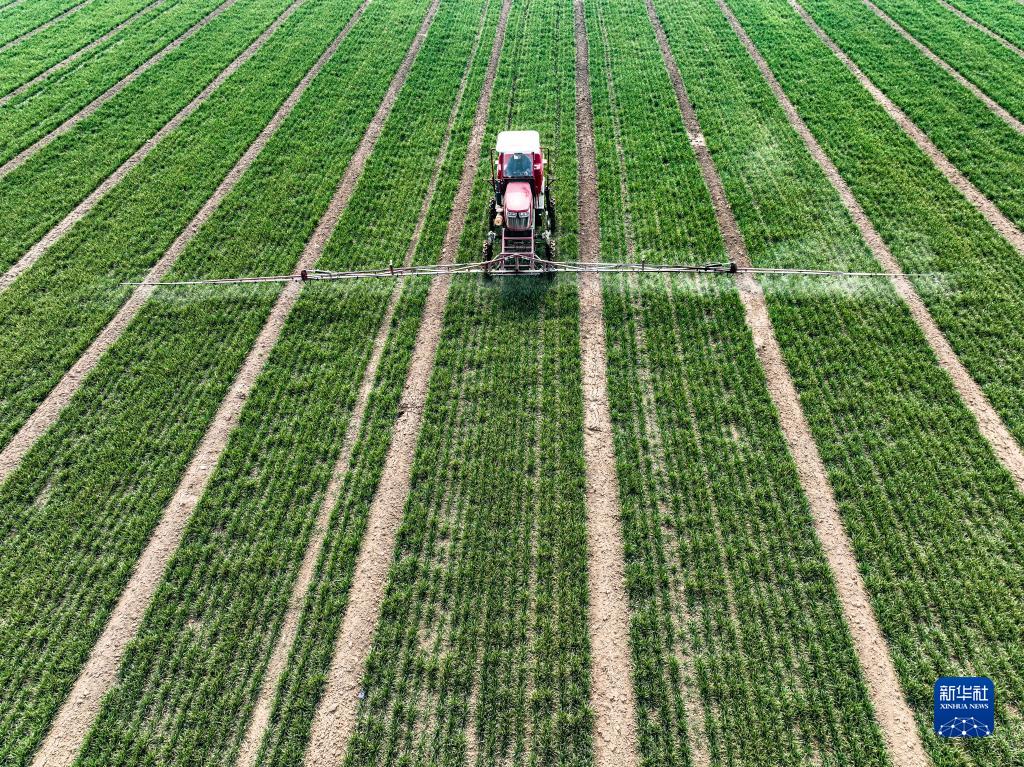 2月23日,河南省濟源市克井鎮酒務(wù)村農民駕駛農機在麥田噴灑農藥(無(wú)人機照片)。