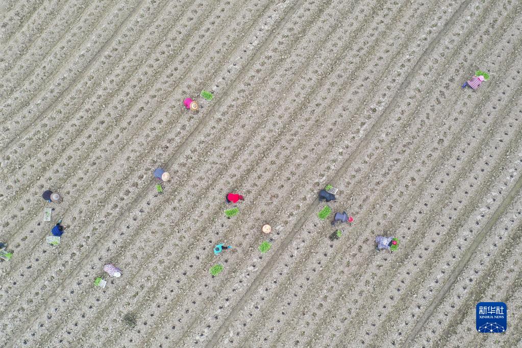 2月24日,在湖南省永州市道縣梅花鎮宜陽(yáng)村,村民在移栽幼苗(無(wú)人機照片)。