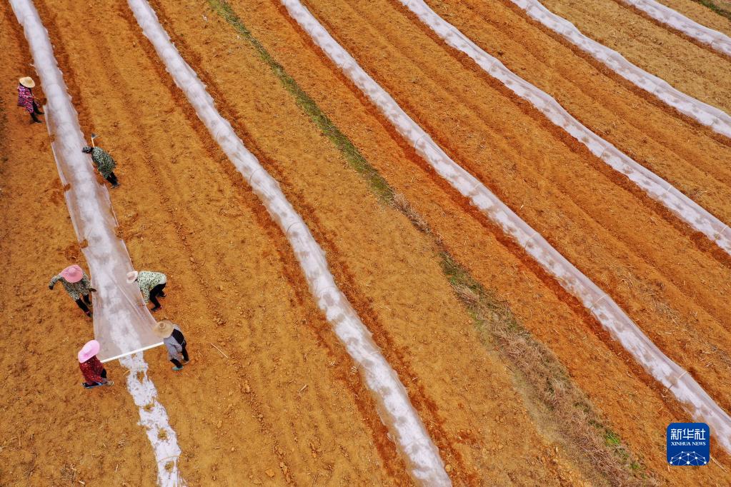 2月23日,在江西省吉安市泰和縣沿溪鎮倉嶺村,農民在田間給莊稼蓋膜(無(wú)人機照片)。