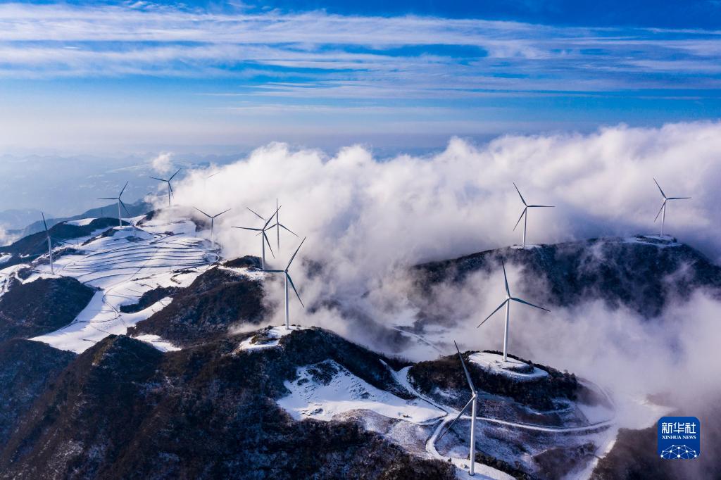 一場(chǎng)春雪過(guò)后,湖北省宜昌市秭歸縣云臺荒風(fēng)力發(fā)電場(chǎng)銀裝素裹,風(fēng)電機組在云海中旋轉,美景如畫(huà)。