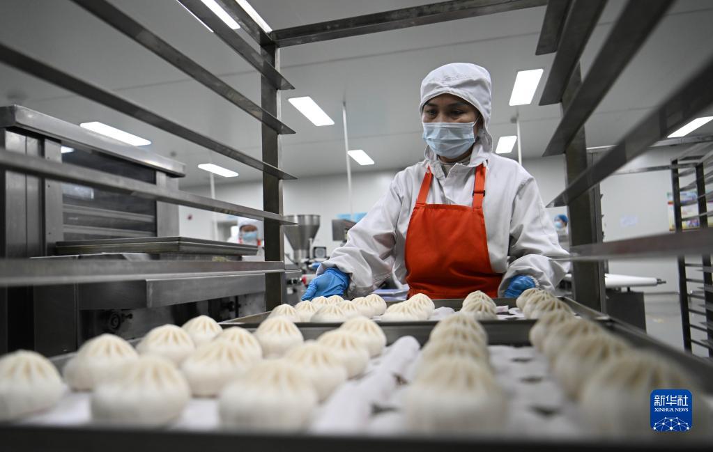 天津利達糧油有限公司速凍面食生產(chǎn)車(chē)間,工作人員在搬運速凍包子(2月23日攝)。