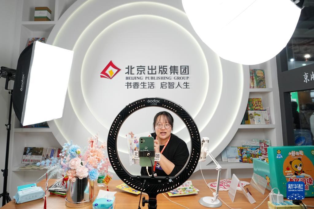 2月24日,在第35屆北京圖書(shū)訂貨會(huì )上,一名參展商工作人員在訂貨會(huì )現場(chǎng)直播,通過(guò)互聯(lián)網(wǎng)介紹書(shū)籍。