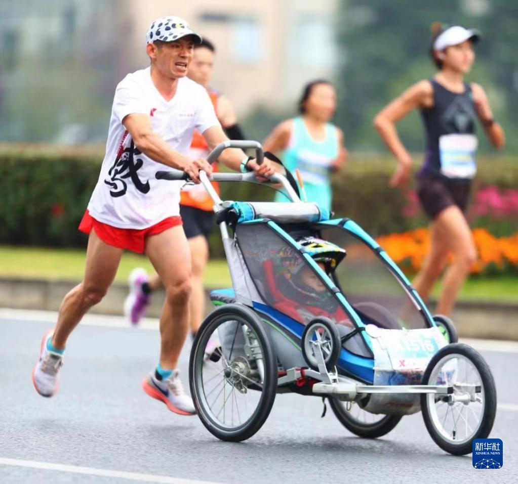 羅書(shū)堅推著(zhù)兒子小柏參加成都馬拉松(2020年11月29日攝)。