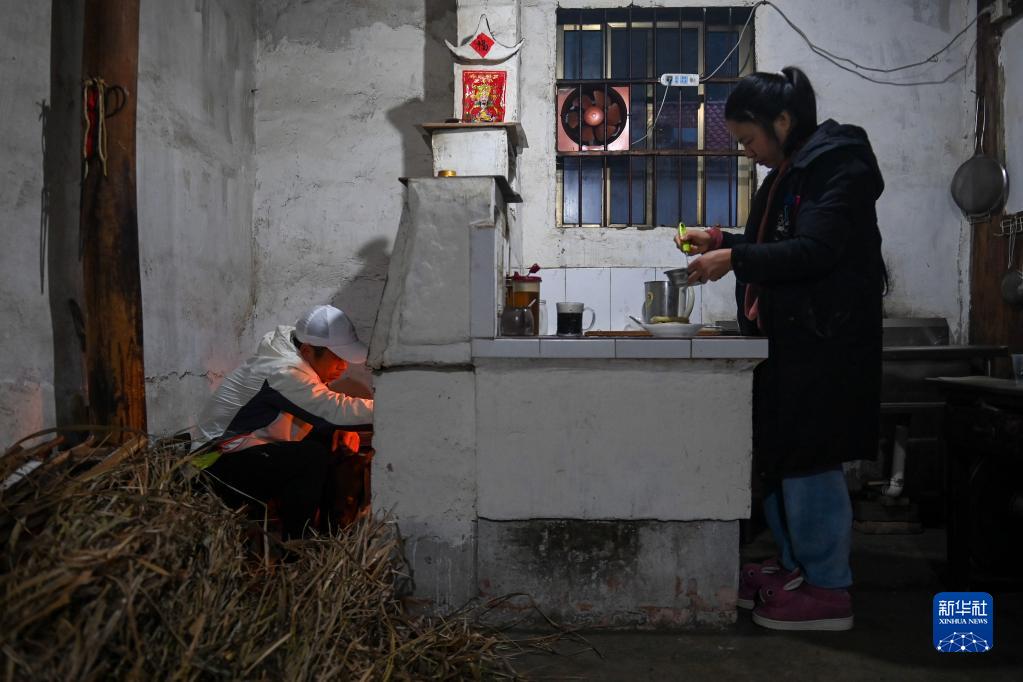 2月24日清晨,羅書(shū)堅(左)在出門(mén)跑步前幫助妻子燒火做早餐。