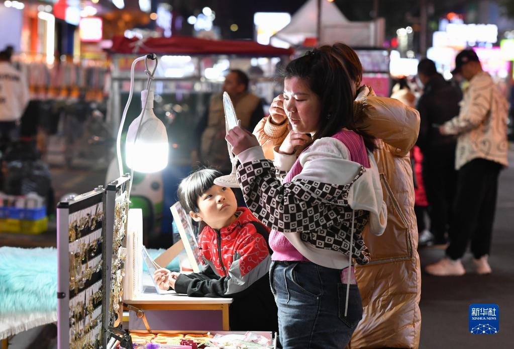 消費者在石獅后花夜市一首飾配件地攤選購耳墜(2月23日攝)。