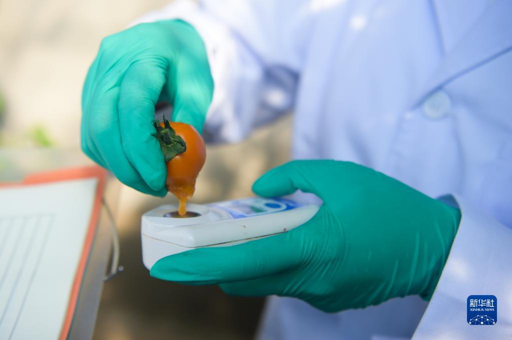 2月24日,在內蒙古自治區農牧業(yè)科學(xué)院蔬菜花卉研究所育種試驗基地,工作人員測定番茄糖度。