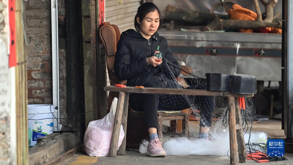 在欽州老街,市民在縫補漁網(wǎng)(2月23日攝)。