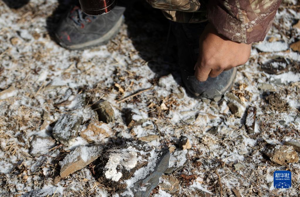 2月21日,更求曲朋在昂賽大峽谷里巡護時(shí)查看巖羊留下的毛發(fā)。