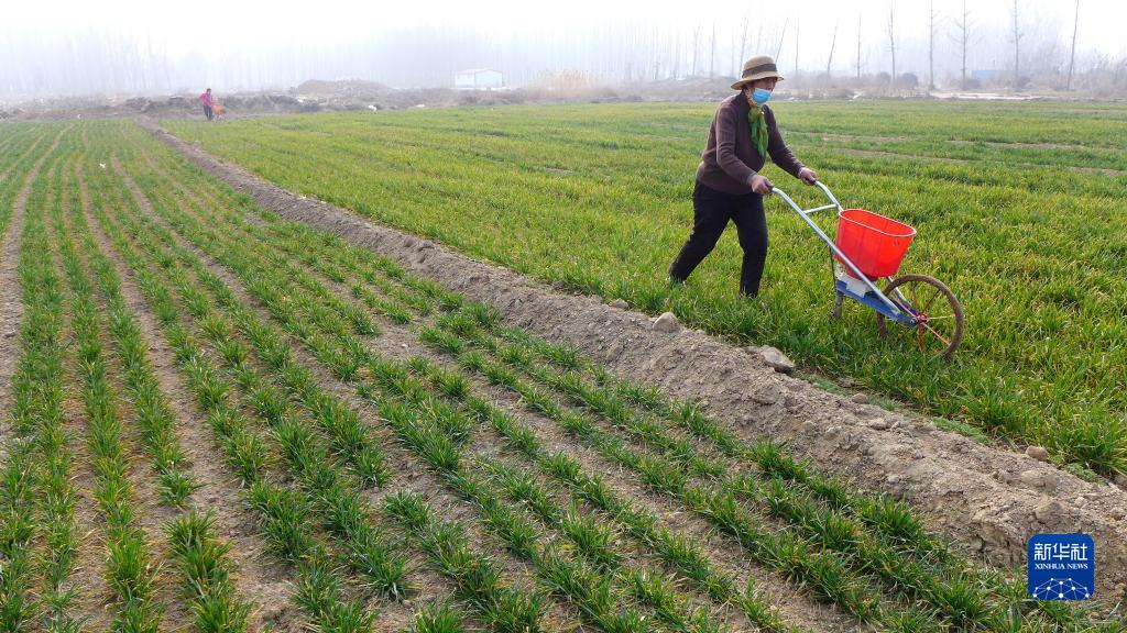 2月24日,河南省開(kāi)封市龍亭區柳園口鄉農民在田間給小麥追施復合肥。