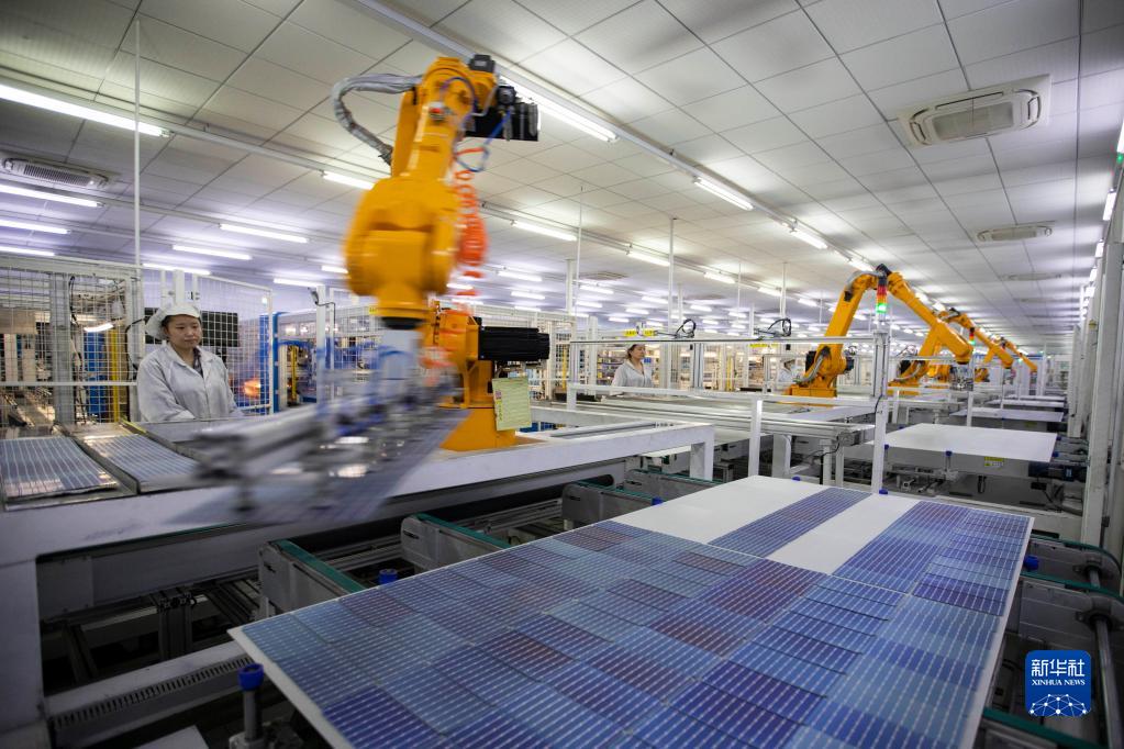 2月24日,在山東省東營(yíng)市廣饒縣的東營(yíng)大??屏止怆娪邢薰局悄芑?yáng)能組件生產(chǎn)車(chē)間,工人在調試設備,生產(chǎn)出口的光伏組件。