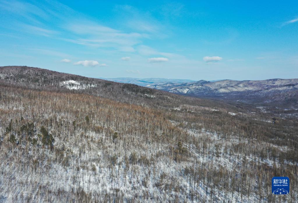 2月23日拍攝的內蒙古森工集團滿(mǎn)歸森工公司烏龍岱林場(chǎng)景色(無(wú)人機照片)。