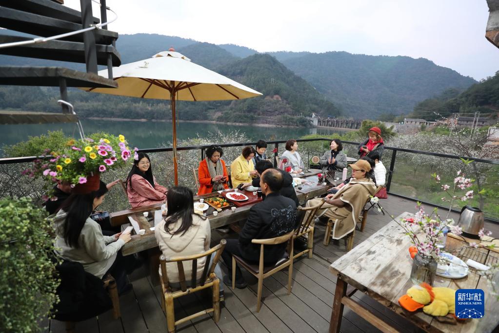 福州市永泰縣嵩口鎮大喜村游客在李花環(huán)繞的觀(guān)景臺上聊天(2月24日攝)。