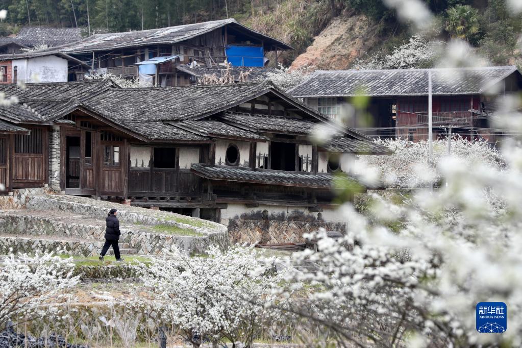 福州市永泰縣蓋洋鄉蓋洋村“三對厝”周?chē)㈤_(kāi)的李花與古厝相映成趣(2月24日攝)。