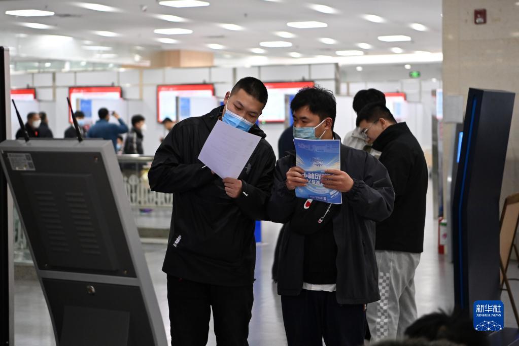 2月25日,在太原人力資源服務(wù)產(chǎn)業(yè)園,求職者在招聘會(huì )現場(chǎng)交流招聘信息。