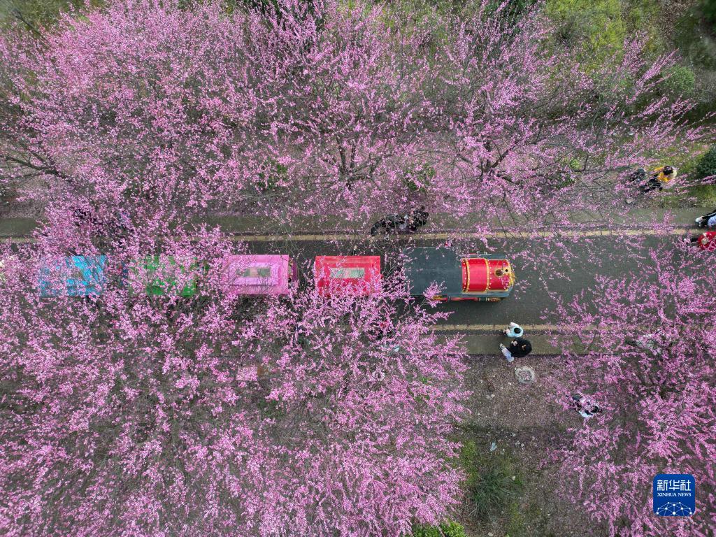 2月25日,游客乘坐觀(guān)光小火車(chē)穿行在貴州省遵義市余慶縣子營(yíng)街道梅花園內賞花(無(wú)人機照片)。
