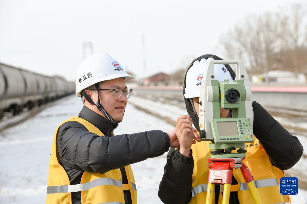 2月25日,黃騰(左)與同事在富錦火車(chē)站進(jìn)行勘察測量作業(yè)。