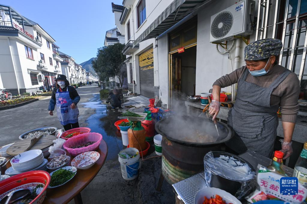 2月26日,蓮花鎮戴家新村的村民在新居門(mén)前烹飪農家菜,為百家宴做準備。