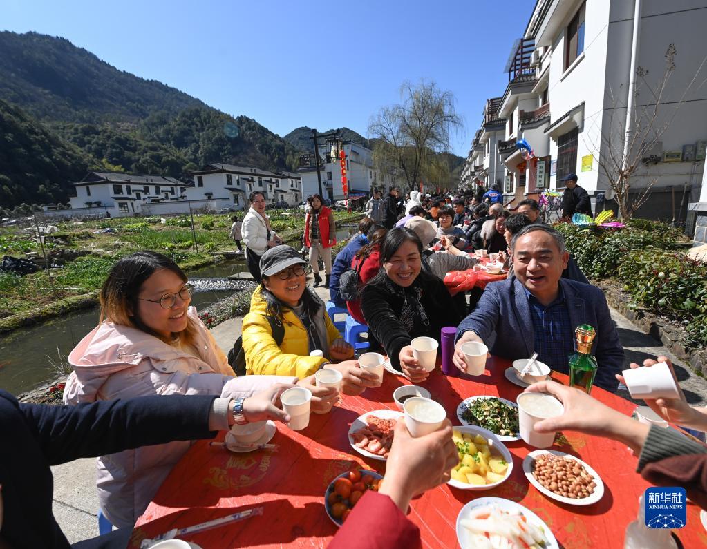 2月26日,游客們在蓮花鎮戴家新村的百家宴上品嘗特色美食。