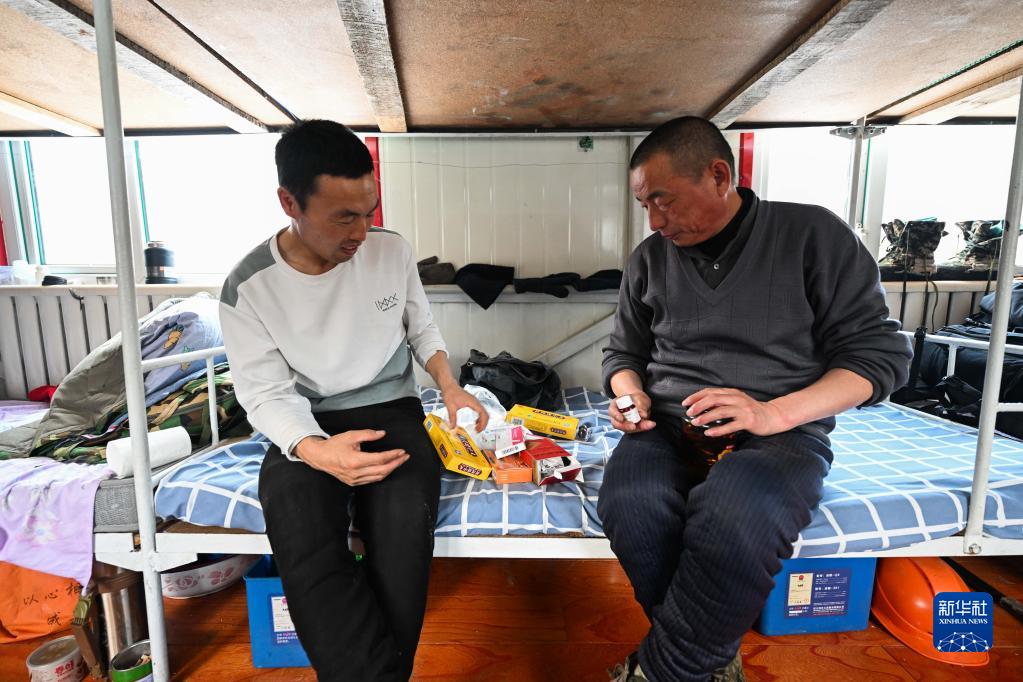 2月22日,烏龍岱林場(chǎng)402工隊職工溫樹(shù)昌(左)和工友何建山在駐點(diǎn)的移動(dòng)板房?jì)日硭幤贰?/p>