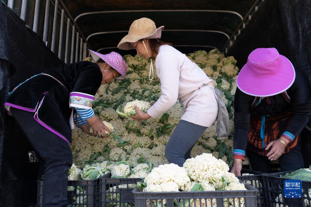2月26日,在貴州省從江縣貫洞鎮貫洞村松花菜種植基地,菜農將剛采摘的松花菜裝車(chē)。