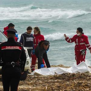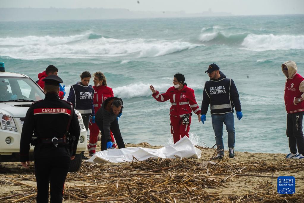 2月26日,在意大利南部卡拉布里亞大區庫特羅附近,紅十字會(huì )志愿者和海岸警察發(fā)現一具移民船沉船事故遇難者遺體。