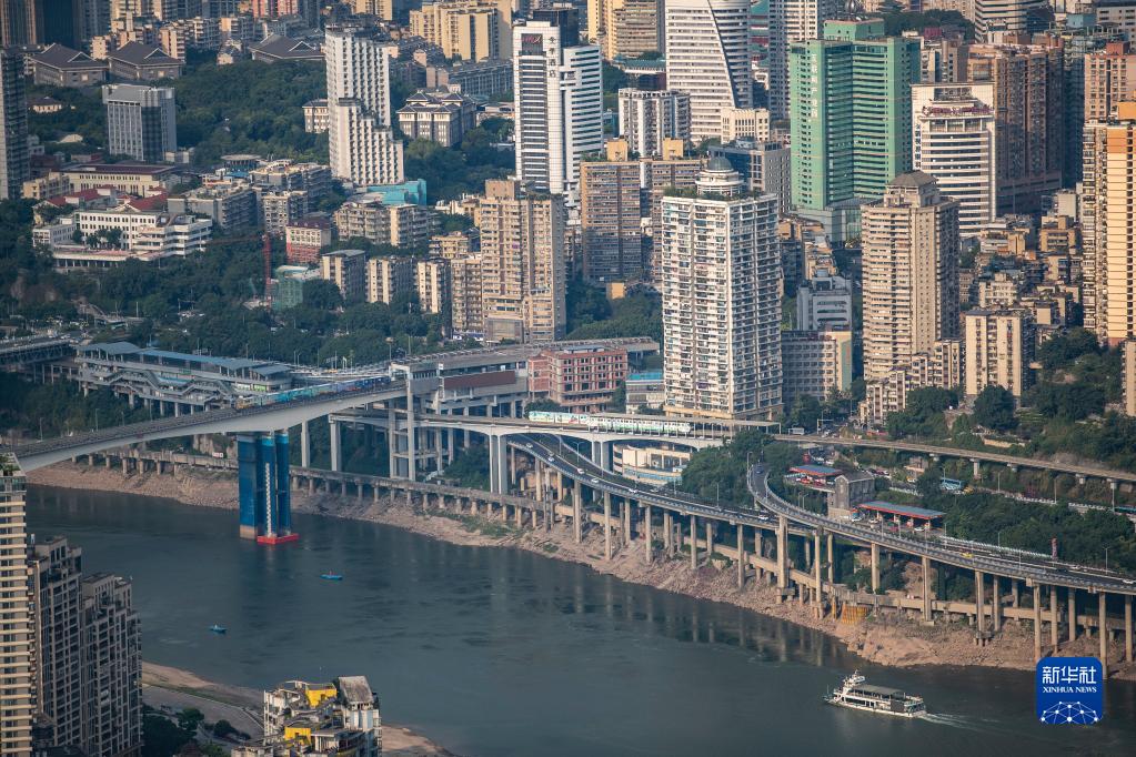 這是2022年7月13日拍攝的運營(yíng)中的重慶軌道交通2號線(xiàn)列車(chē)(右下)和3號線(xiàn)列車(chē)(左上)。
