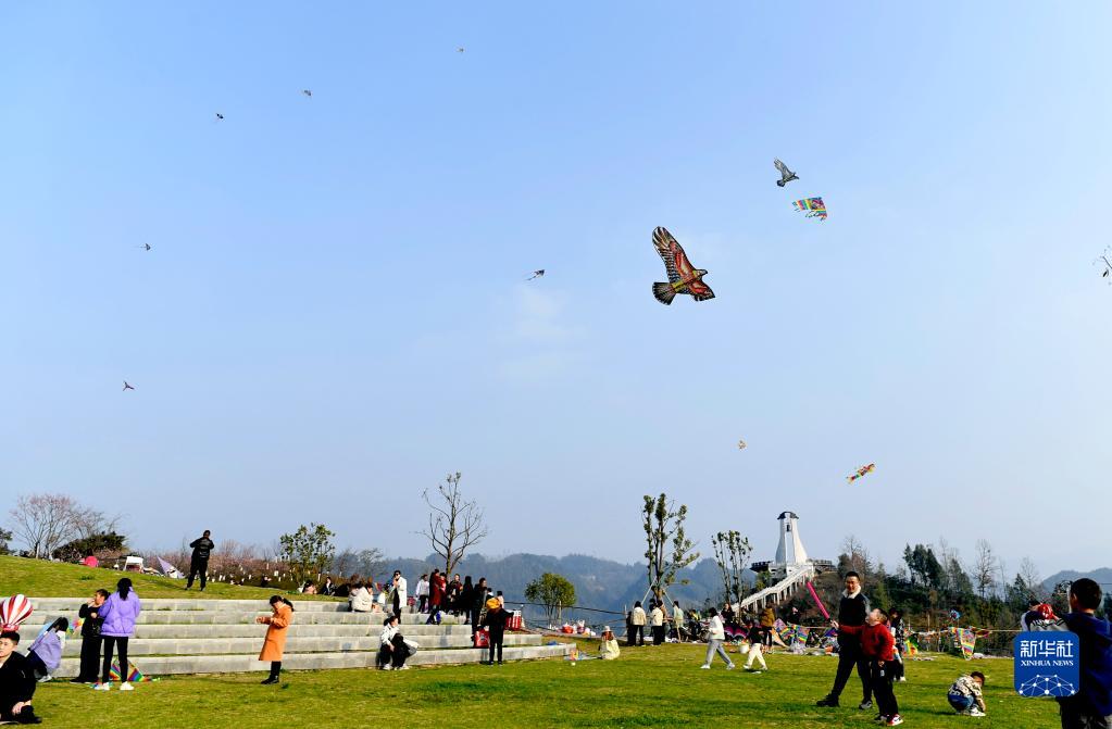 2月27日,人們在湖北省宣恩縣仙山貢水旅游區的一處草坪上放風(fēng)箏。