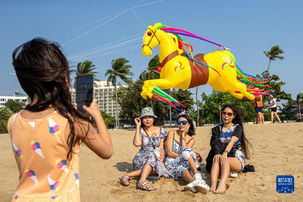2月27日,游客在泰國芭提雅海灘與風(fēng)箏合影。泰國芭提雅近日舉辦海灘風(fēng)箏節。