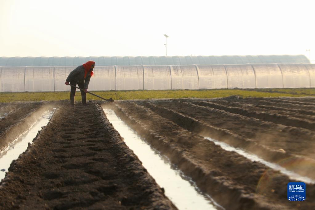 2月27日,在山東省高密市柏城鎮高家莊村,村民在田里澆水準備播種土豆。