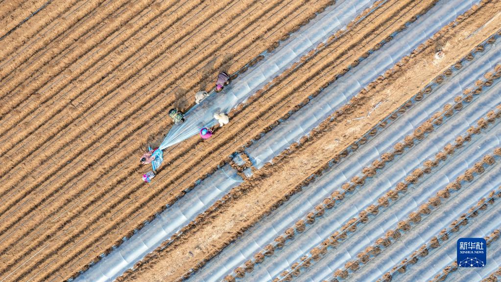 2月27日,河北省唐山市豐南區岔河鎮王各莊村農民為剛剛栽種的馬鈴薯覆膜。
