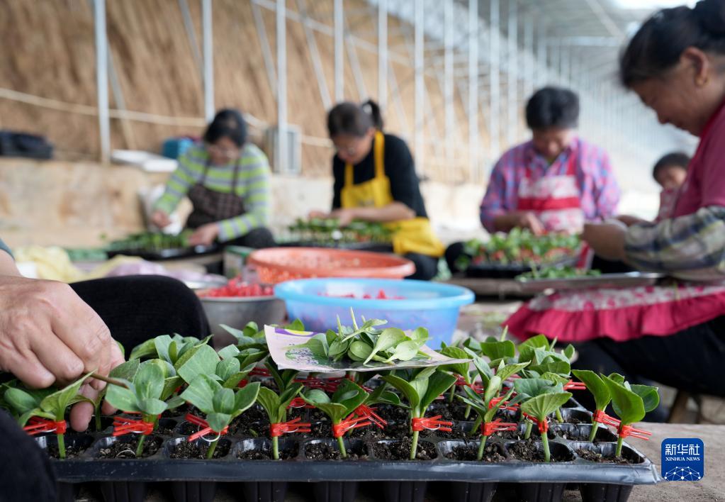 2月28日,安徽省全椒縣武崗鎮太平農作物幼苗培育合作社的農民在育苗溫棚內嫁接西瓜苗。