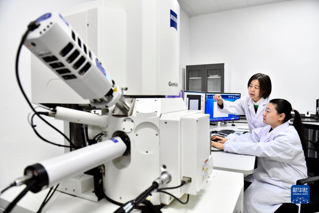 在山鋼集團日照公司鋼鐵研究院場(chǎng)發(fā)射掃描電鏡室,胡淑娥和同事對鋼中析出物進(jìn)行分析研究(2月15日攝)。