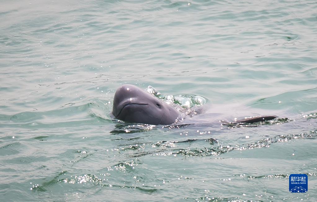 在湖北省宜昌市,長(cháng)江江豚在水中嬉戲(2021年5月11日攝)。
