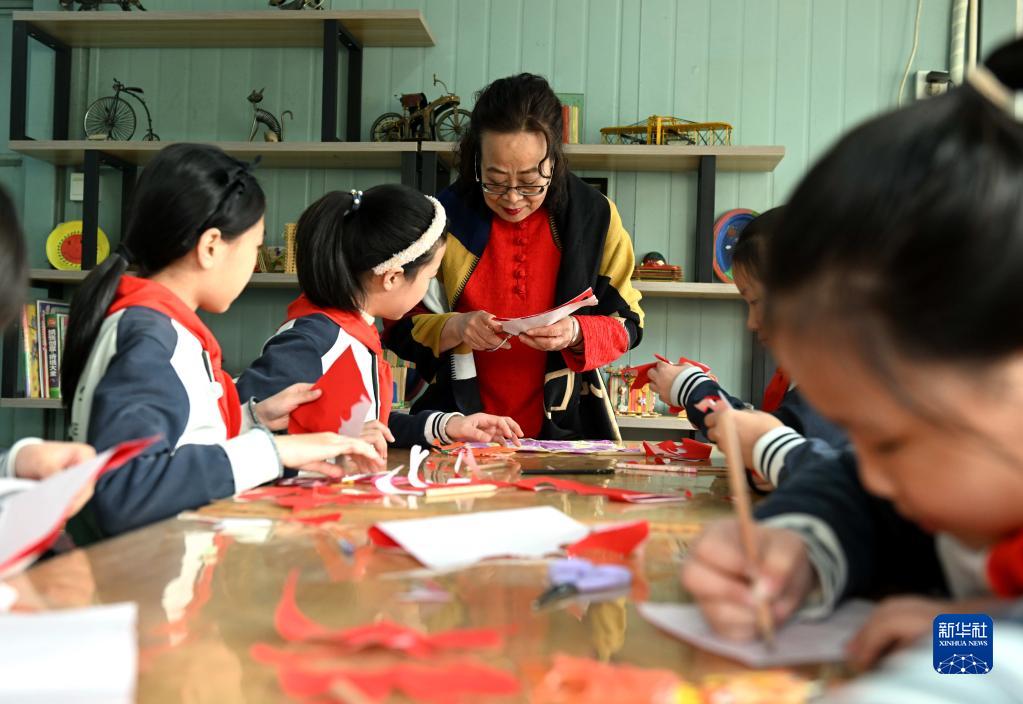 2月28日,國家級非遺蔚縣剪紙代表性傳承人周淑英(左三)在石家莊市東風(fēng)小學(xué)非遺工坊給學(xué)生傳授剪紙技藝。