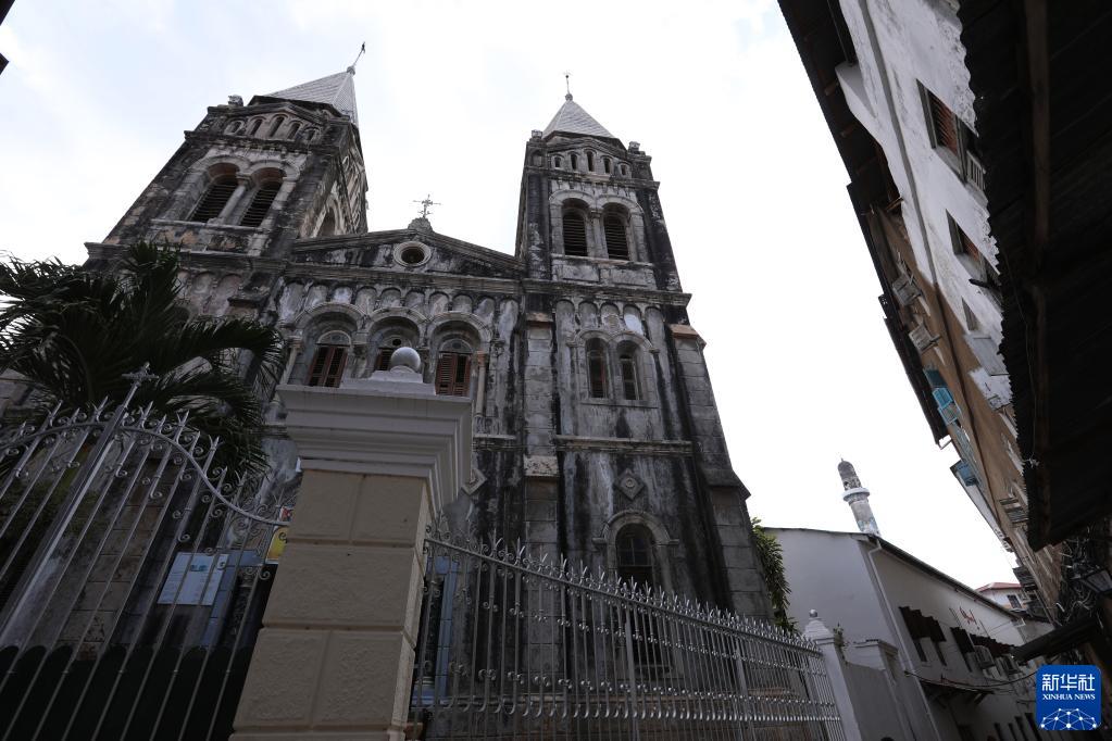 這是2月23日在桑給巴爾石頭城拍攝的天主教大教堂(左)、清真寺宣禮塔(中)及民居(右)。