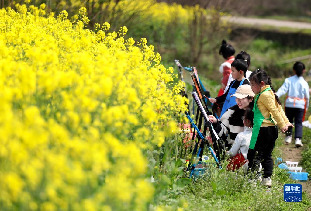 2月28日,在湖南省資興市唐洞街道高碼村,老師指導小朋友在油菜花田旁畫(huà)畫(huà)。