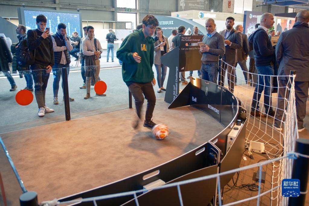 2月28日,一名男子在西班牙巴塞羅那舉行的2023世界移動(dòng)通信大會(huì )上體驗智能足球測試設備。