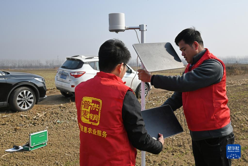 2月28日,在萊西市夏格莊鎮數字農業(yè)產(chǎn)業(yè)園內,技術(shù)人員在架設便攜式氣象基站。
