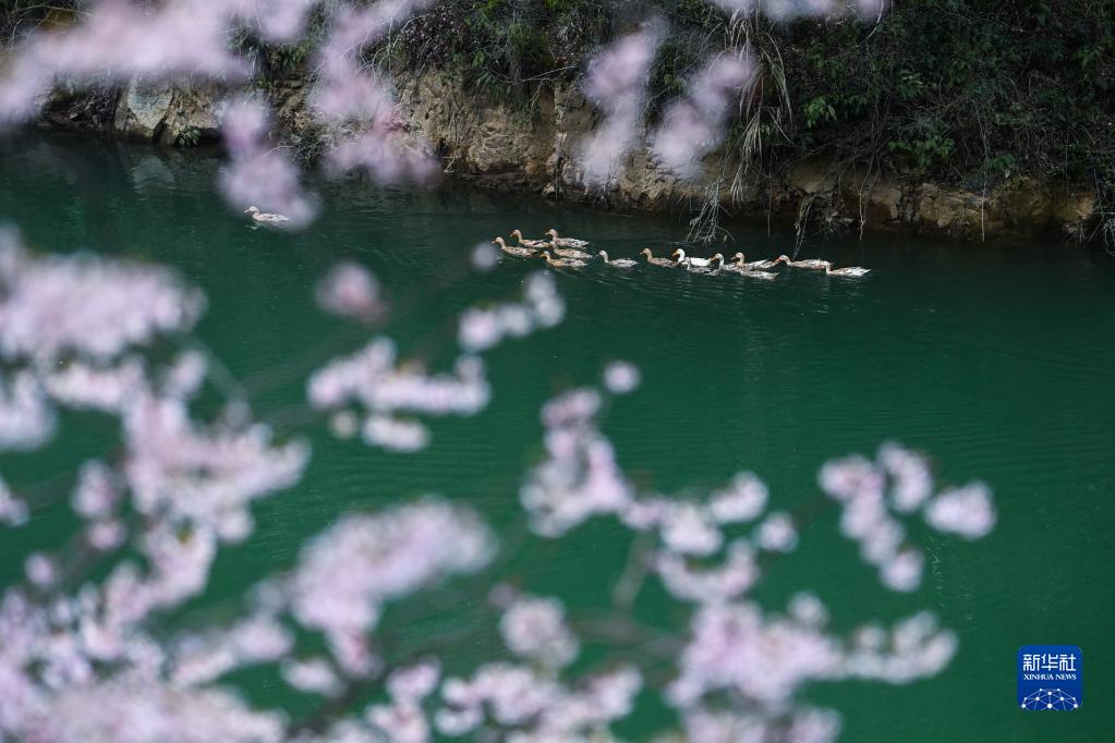 三都鎮大唐村池塘里的鴨子與盛開(kāi)的野櫻花相映成景(3月1日攝)。