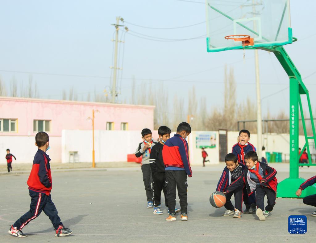 3月1日,和田縣塔瓦庫勒鄉巴克墩村小學(xué)學(xué)生在課間休息時(shí)打籃球。