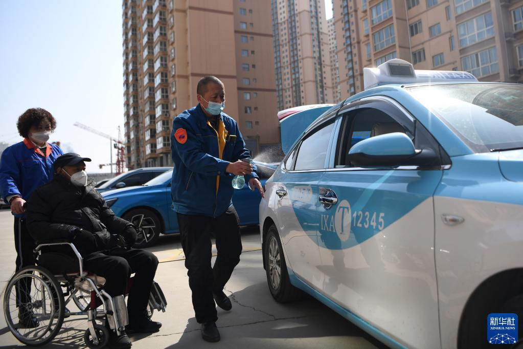 強漢紅(右一)在老人上車(chē)前給車(chē)輛消毒(3月1日攝)。