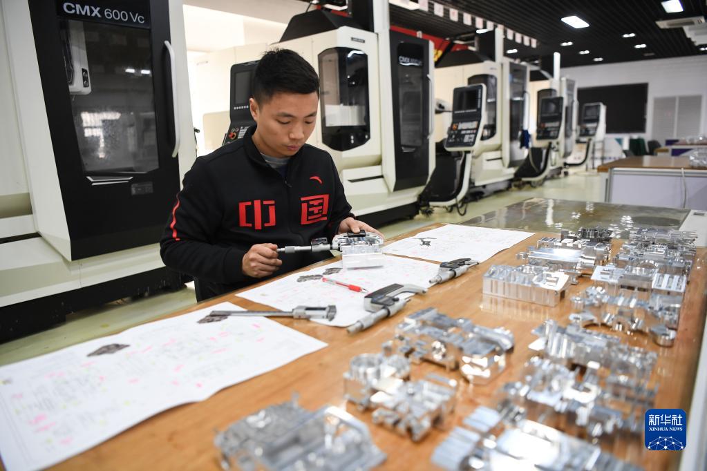 在廣東省機械技師學(xué)院數控銑集訓基地,楊登輝對學(xué)生加工的零部件進(jìn)行測量(2月14日攝)。
