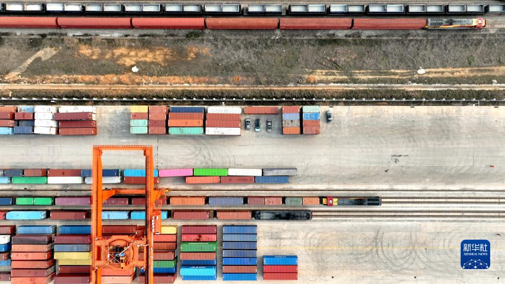 3月2日,班列準備從南昌國際陸港鐵路口岸二期駛出(無(wú)人機照片)。