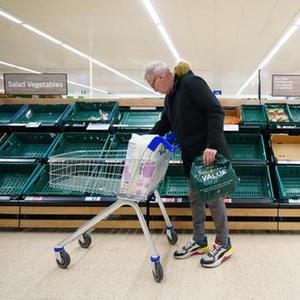 3月2日,在英國曼徹斯特,一家超市的蔬菜貨架出現缺貨。