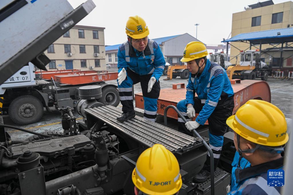在天津港第一港埠有限公司,成衛東在一輛正在維修的拖頭上實(shí)地教學(xué)(2月17日攝)。