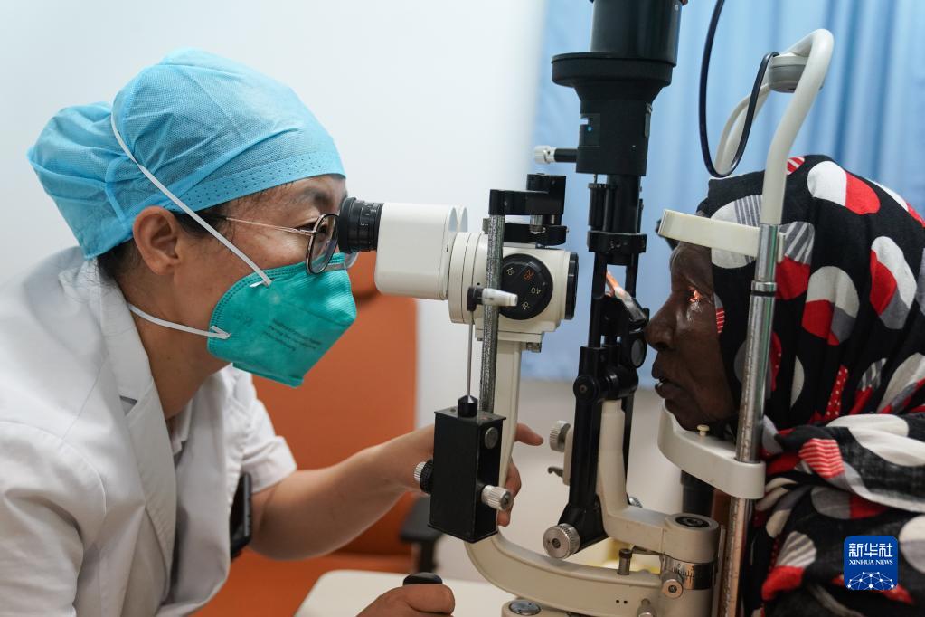3月1日,在吉布提首都吉布提市貝爾蒂耶醫院,中國第21批援吉布提醫療隊醫生周瑞芳為當地患者進(jìn)行眼部檢查。