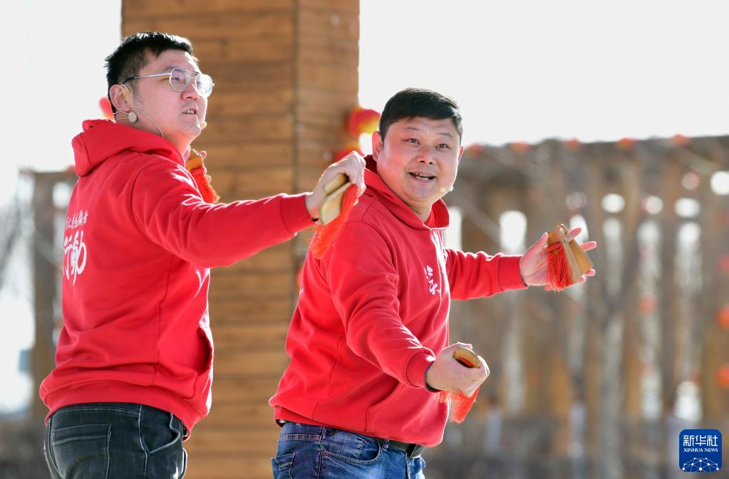 3月3日,在二連浩特市格日勒敖都蘇木賽烏素嘎查文化廣場(chǎng),文藝志愿者為群眾表演對口快板。